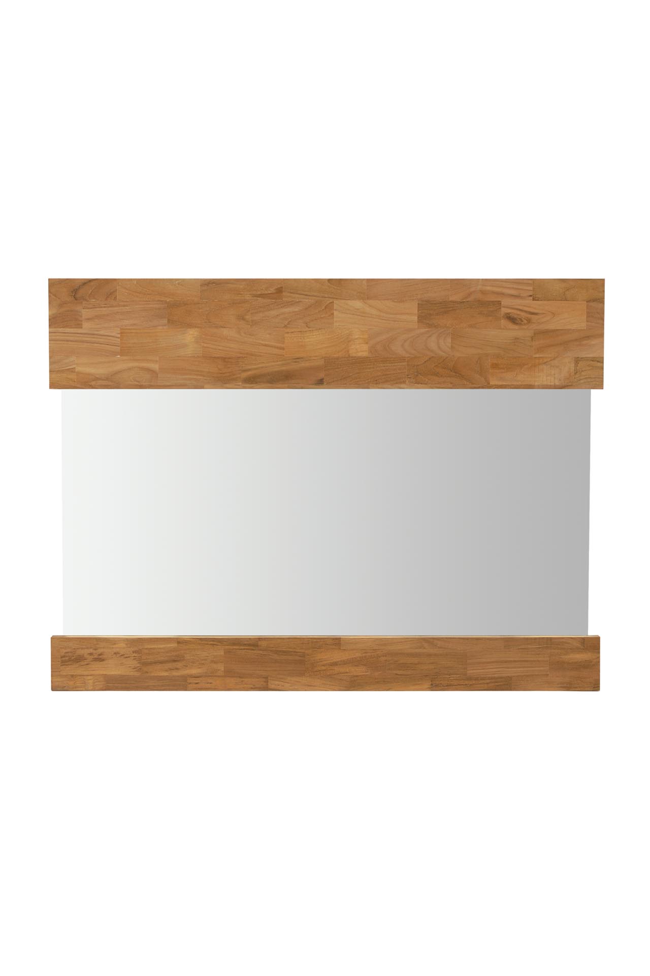 Made from solid teak blockwork, the Block has two differing sized wooden sections with exposed polished edges on the middle section of the mirror. Designed to echo a horizon, the Block works well as a landscape style mirror, as per the picture; however it can also be used length ways, where the exposed glass sections are on the top and bottom.