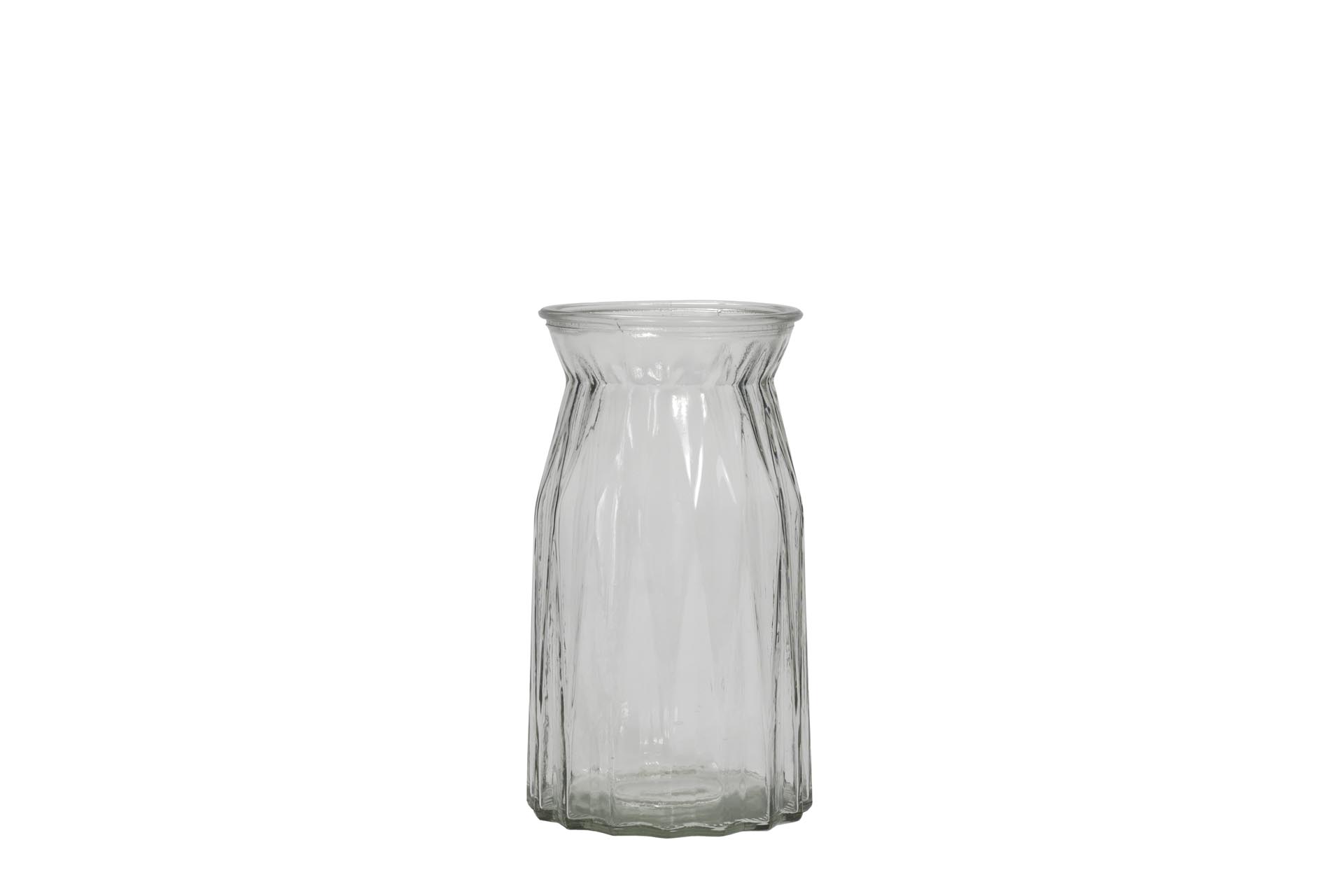 The Flute is a contemporary flower vase in clear glass with a fluted neck and a pleated, almost folded detail to its shape.
