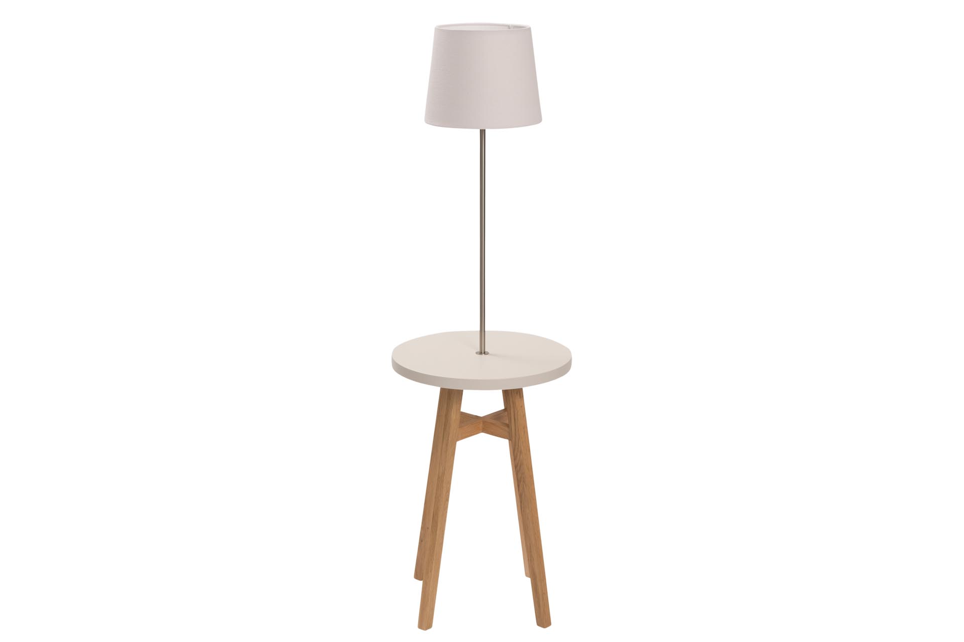 The tapered base of the Kinsale is manufactured in solid oiled oak, which is then paired with the circular table top in a durable painted finish; the integral lamp has a satin nickel neck which is then finished with a tapered shade in a cotton / linen union fabric.