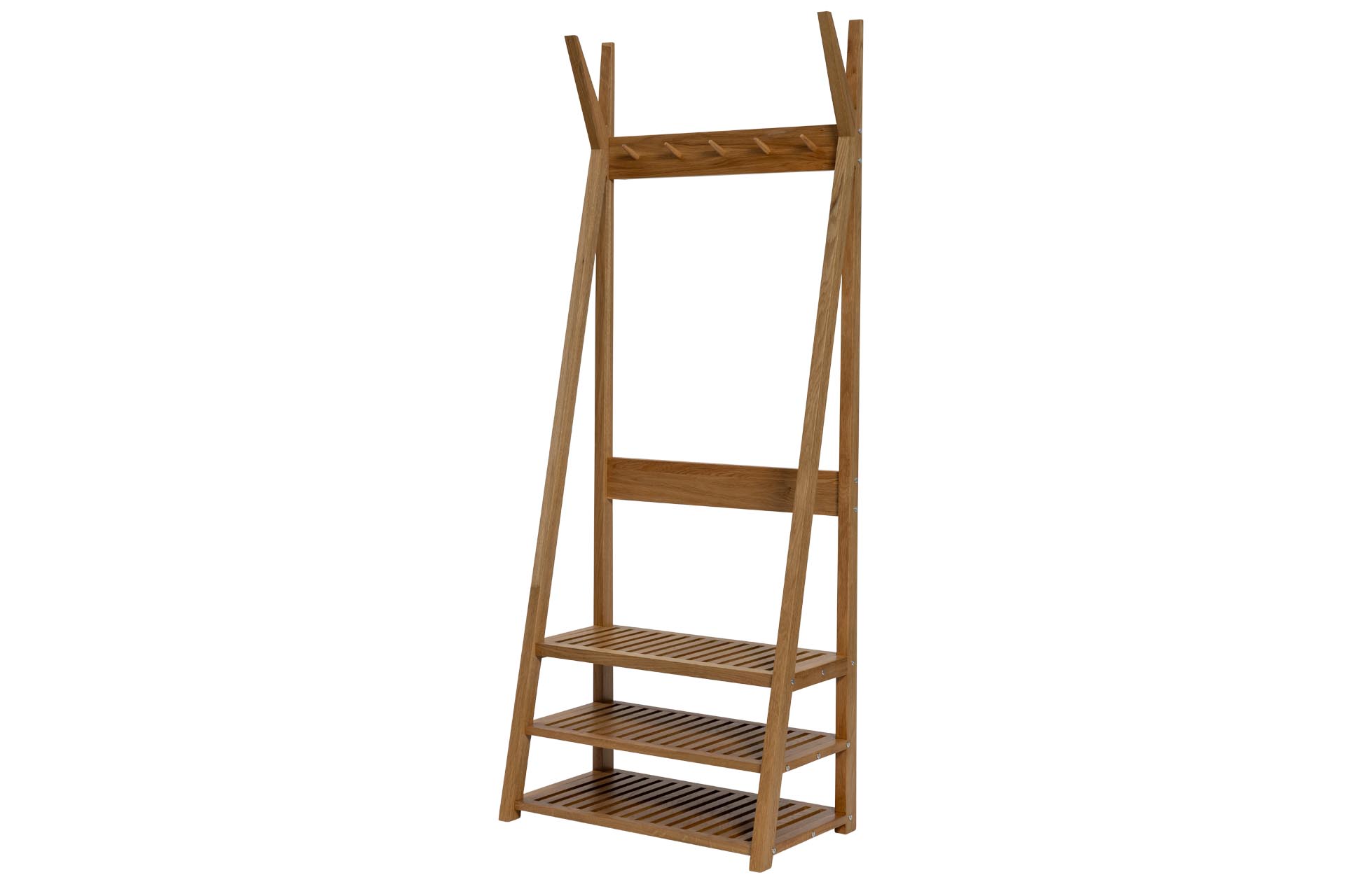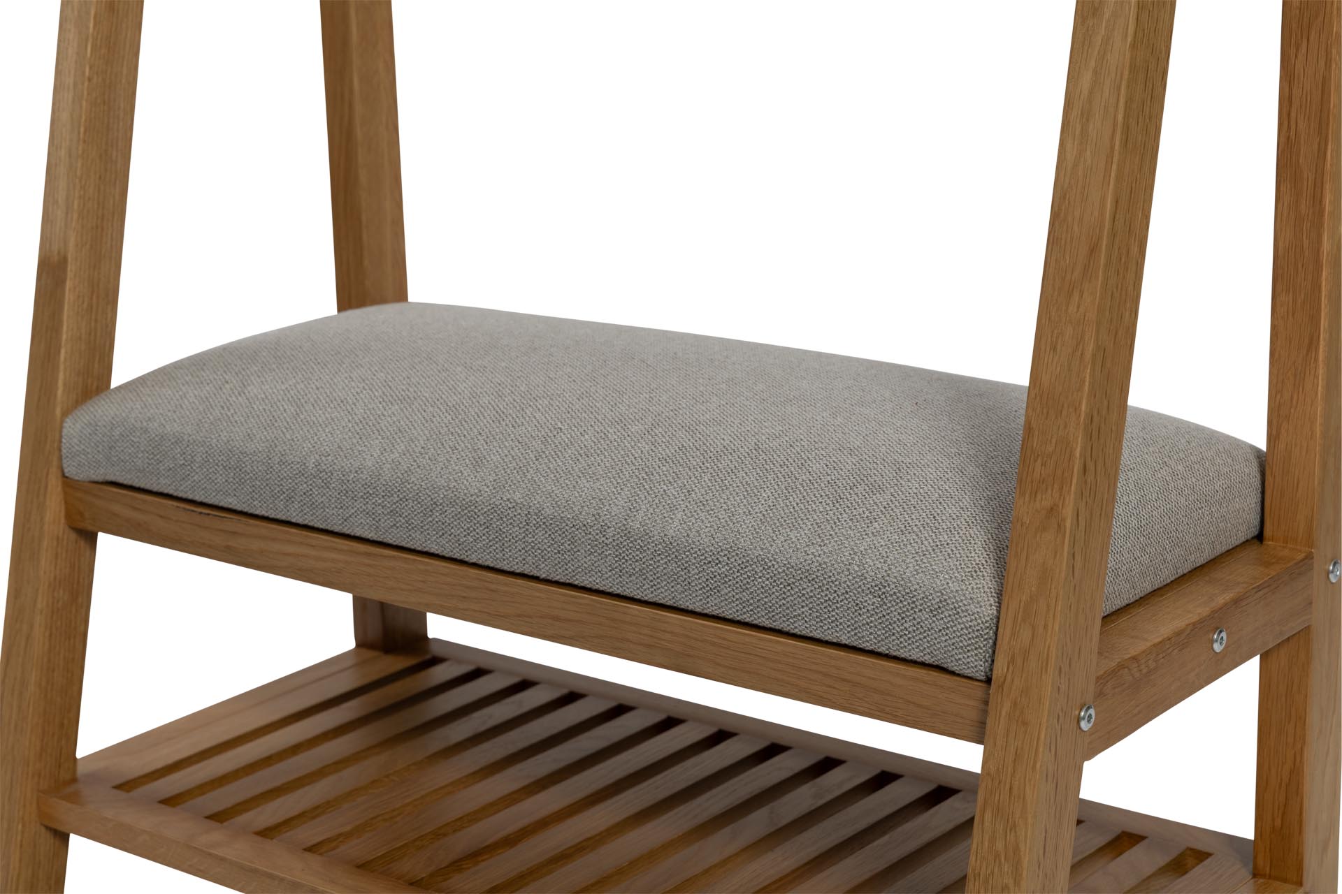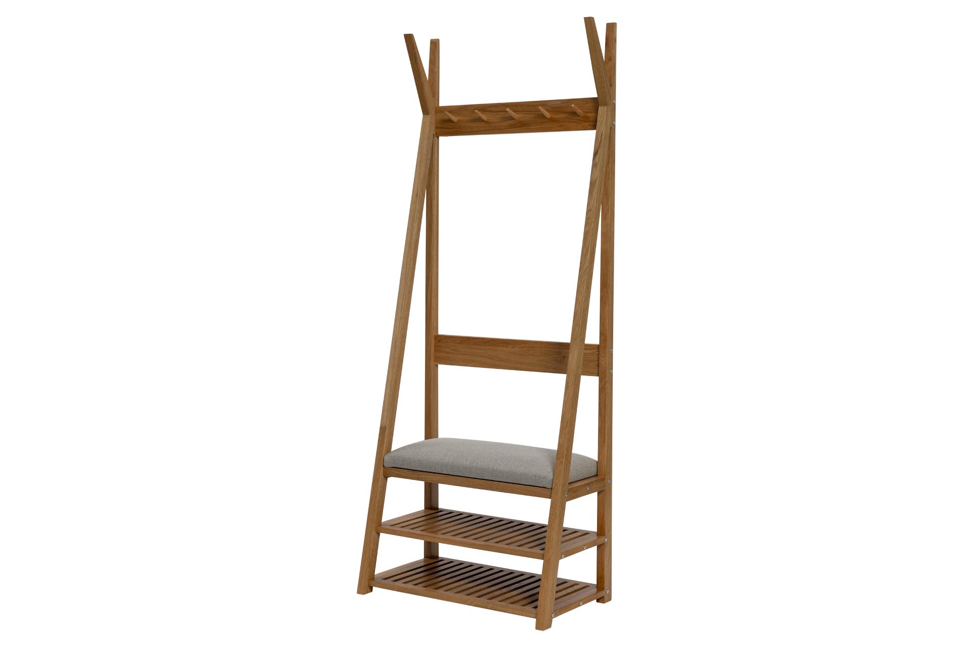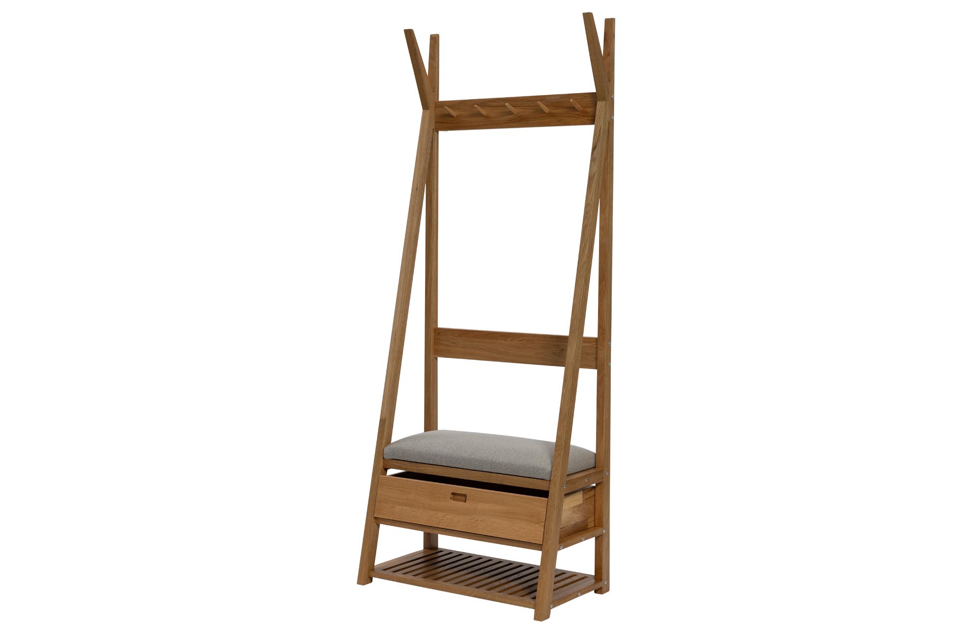 There is plenty of room for coats with five wooden hanging pegs and the emblematic fork detail at the top of the stand is ideal for scarves or hats. There is two slatted shelves for shoe storage and a small bench style seat to rest on, while you’re getting your footwear on and off.