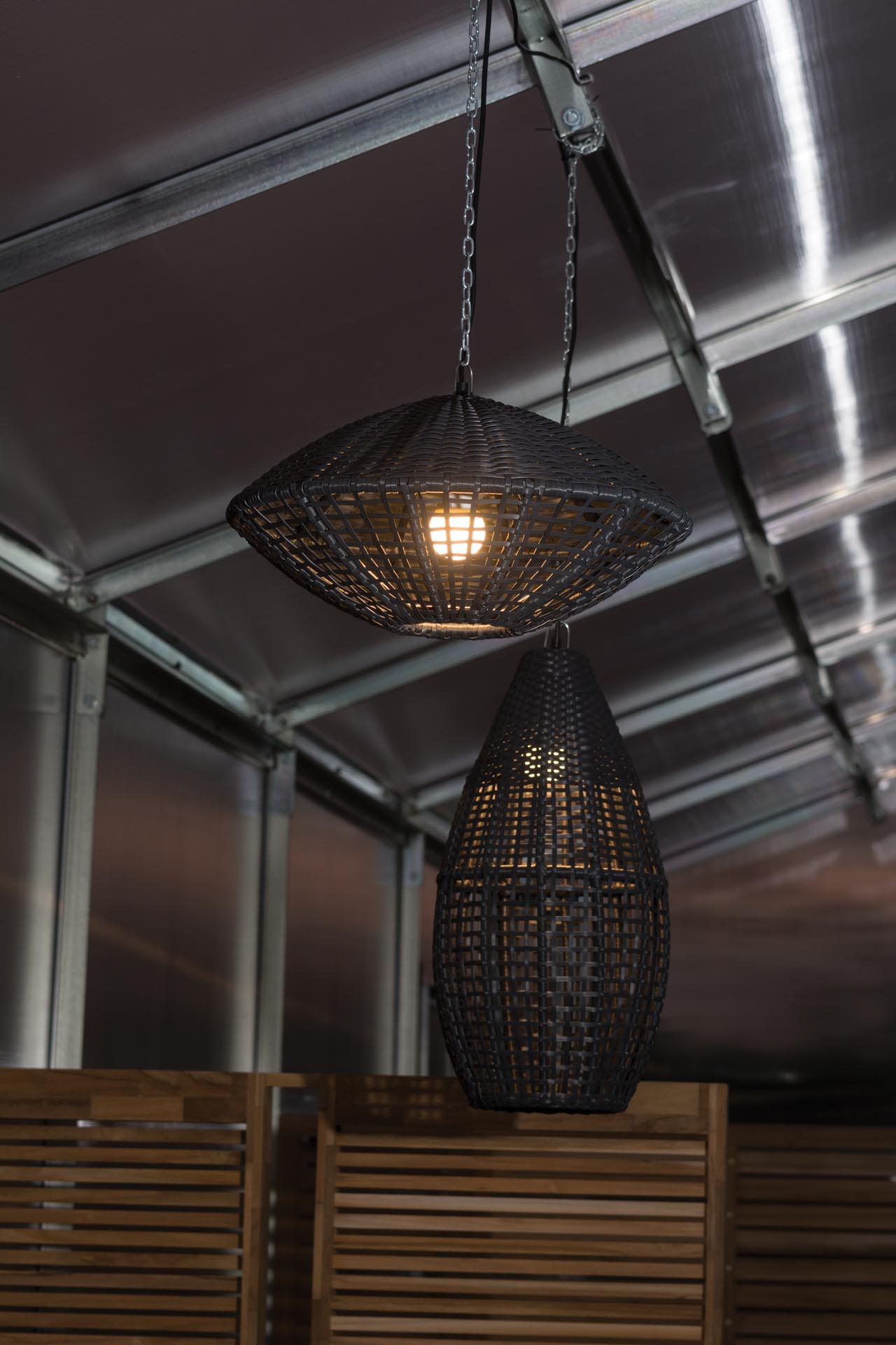 Made in synthetic weave on a powder coated aluminium frame the Wigwam comes complete with a hanging suspension chain. Perfect for an outdoor lighting scheme or partially covered areas, the Wigwam can be used in isolation, in a series or in combination with the Saucer hanging shade.
