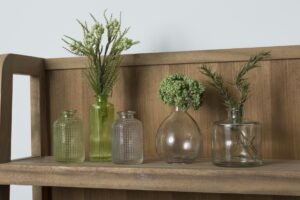small glass vases / bottles – group shot. left to right: celeste light green, camile vintage green, celeste clear, giselle clear & odette clear