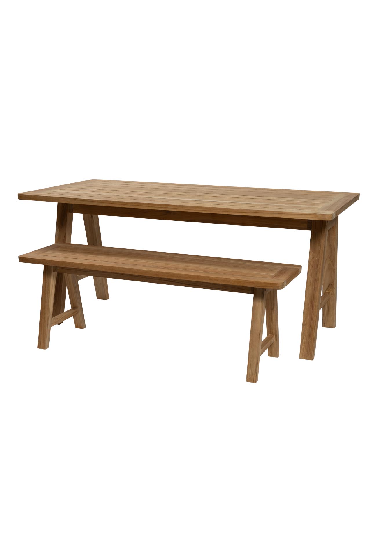 trestle outdoor dining table and bench in plantation teak